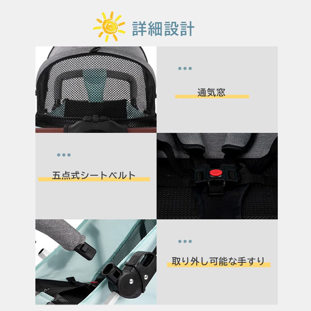 【赤ちゃんにやさしい】さらっと快適メッシュシート、頭を守るヘッドサポート、ハイシート、日差しをカットする大きな日よけ、サスペンションで振動を吸収。