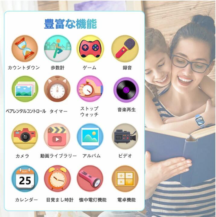 超軽量で快適なスマートウォッチで、カメラ、ボイスレコーダー、学習ゲーム、音楽、目覚まし時計の機能を内蔵し、5歳から14歳までのお子様に最適です。すべての子供たちが学習と娯楽を楽しむための素晴らしい贈り物です。また音楽プレーヤーとしても使用でき、mp3形式の音楽をPCからUSB接続でダウンロードすることができます。スピーカーを内蔵し、音量調節も可能です。750 mAhの大容量バッテリーは 2-3時間で満充電でき、3-4時間の連続使用、5-7日間の待機が可能です。